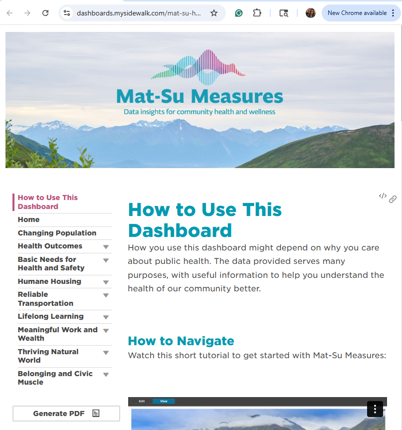Mat-Su Measures is the newest tool created by the Mat-Su Health Foundation to put the health data of today into the hands of Mat-Su residents. The dashboard gives all users diverse health statistics that are specific to Mat-Su. It compiles complex information into one place, making it easy to access and understand.